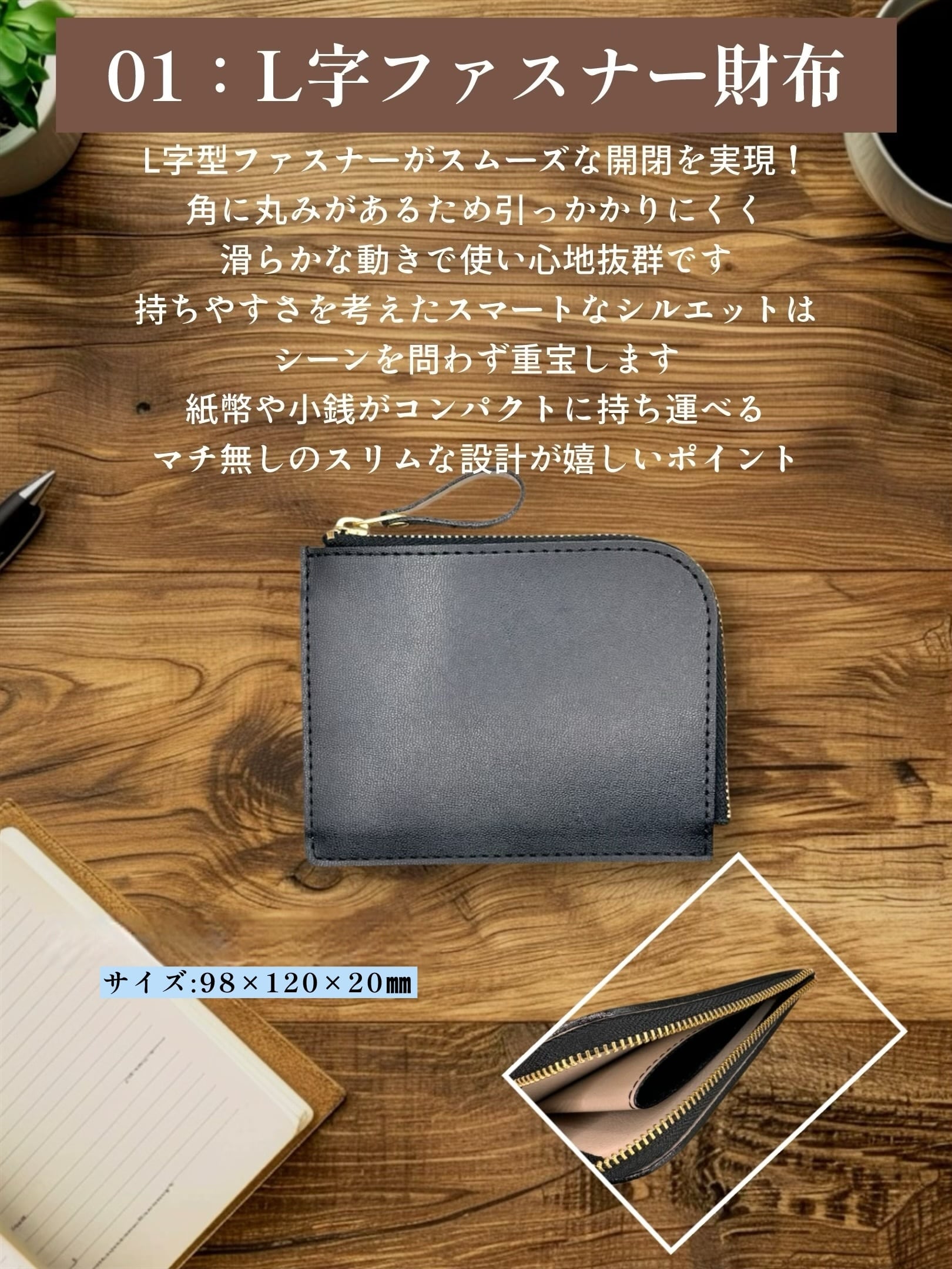 L字型ファスナーがスムーズな開閉を実現。角に丸みがあるため引っかかりにくく、滑らかな動きで使い心地抜群です。持ちやすさを考えたスマートなシルエットは、シーンを問わず重宝します。